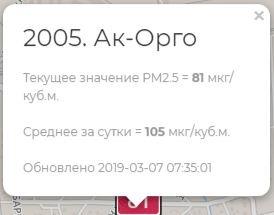 Ак-Өргөө конушунда учурдагы көрсөткүч - 81 микрограмм (сутка ичиндеги орточо көрсөткүч - 105). Бул нормага ылайык көрсөткүчтөн 3,23 эсеге жогору. Дүйнөлүк саламаттыкты сактоо уюмунда сутка ичинде орточо эсеп менен куб метрге 25 микрограмм болгон көрсөткүч норма катары саналат.