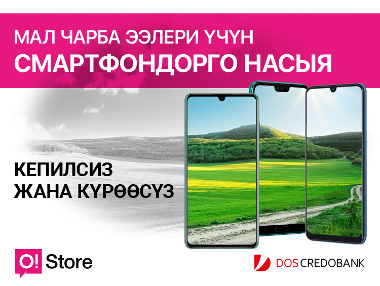 O!Store дүкөндөр тармагы мал чарба ээлерине жаңы смартфонду өзгөчө шарттарда кепилсиз жана күрөөсүз насыяга сатып алууну сунуштайт. Бул насыянын түрү бодо мал өстүрүүчү чарбалардын ээлерине берилет жана О!Store тармагынын бардык дүкөндөрүндө "Дос-Кредобанк" ААКсы менен өнөктөштүктө жолжоболоштурулат.