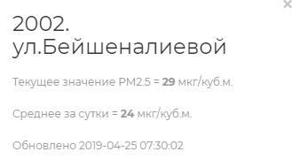 Бейшеналиева-Токтогул көчөлөрүнүн кесилишинде учурдагы көрсөткүч - 29 микрограмм (сутка ичиндеги орточо көрсөткүч - 24).