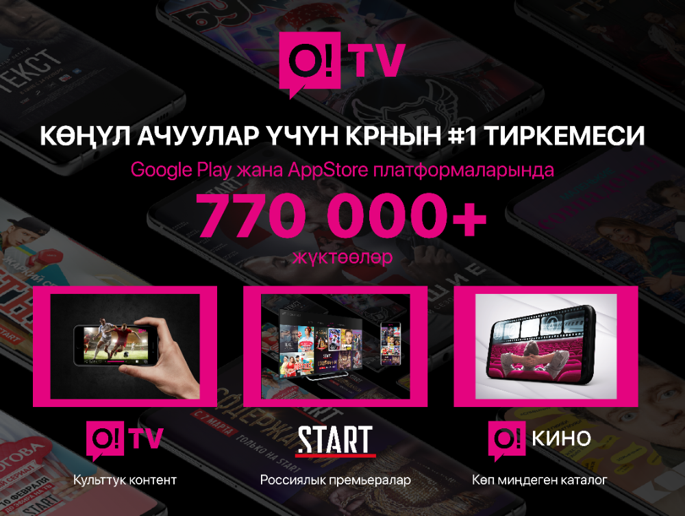 O!TV тиркемеси дагы колдонуучуларын жаңы каналдары менен кубантты, алардын ичине атактуу UFC ТВ дагы кирди. Бүт дүйнө менен бирге «Игра престолов» сериалы сыяктуу культтук премьераларды да көрүшүңүздөргө болгон мүмкүнчүлүктөр жумшалды. O!TV тиркемесинин «Кыргызстандагы көңүл ачуулар үчүн №1 мобилдик тиркеме» болушуна сиздер гана түрткү бердиңиздер, биз аны жаңы «фишкалар» жана сервистер менен жакшыртып келе жатабыз. Жакында эле START менен эң мыкты россиялык фильмдер жана сериалдар кошулду.