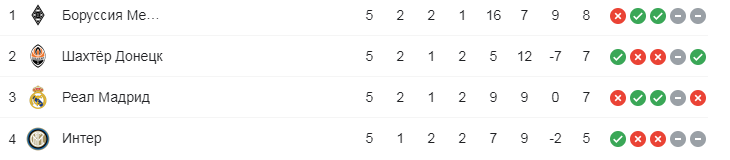 Муну менен турнирде фаворит командалардын бири болгон Испаниянын "Реал Мадрид" командасы "Шахтёрдон" эки оюнда тең жеңилип, тайпада үчүнчү орунда келе жатат (7 упай). Акыркы тайпалык оюнда "Реал" өз үйүндө Германиянын "Боруссия Менхенгладбах" командасын кабыл алат. Бул оюнда испаниялык команда сөзсүз жеңишке жетиши керек.