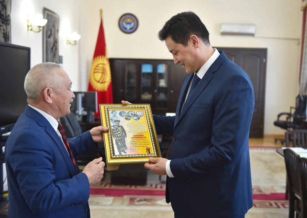 Өкмөт башчы олимпиада чемпиону Каныбек Осмоналиевди энчилүү сааты менен сыйлап, көп томдуу «Кыргыздар» китебин белекке тапшырган.