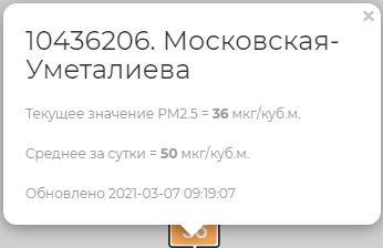Москва-Үмөталиев көчөлөрүнүн кесилишинде учурдагы көрсөткүч - 36 микрограмм (сутка ичиндеги орточо көрсөткүч – 50). Дүйнөлүк саламаттыкты сактоо уюмунда орточо эсеп менен куб метрге 25 микрограмм болгон көрсөткүч норма катары саналат.