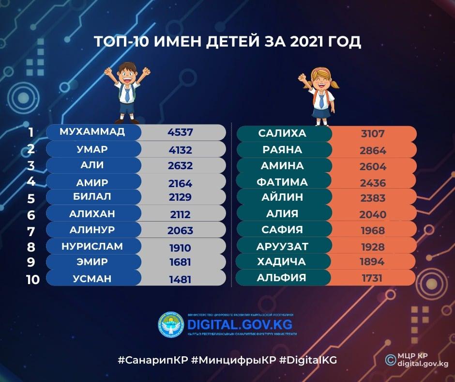 Санариптик өнүктүрүү министрлиги 2021-жылга карата популярдуу болгон ысымдардын рейтингин жарыялады. Ага ылайык, эркек балдар арасында көп коюлган он ысымдын катарына: Мухаммад, Умар, Али, Амир, Билал, Алихан, Алинур, Нурислам, Эмир жана Усман кирет. Кыздар арасында: Салиха, Амина, Фатима, Айлин, Алия, Хадича, Аруузат, Сафия жана Арууке.