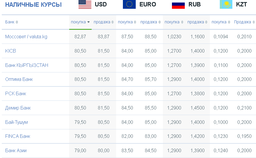 Өлкөнүн коммерциялык банктарында жана акча алмаштыруучу жайларда 1 долларды сатып алуу 79 сомдон 80 сом 50 тыйынга чейин болсо, сатуу 80 сомдон 81 сом 50 тыйынга чейин болууда.