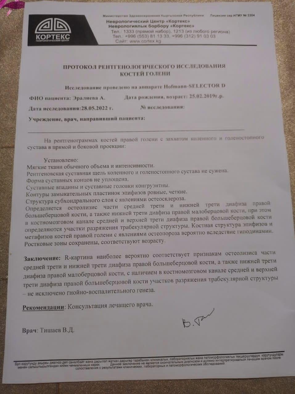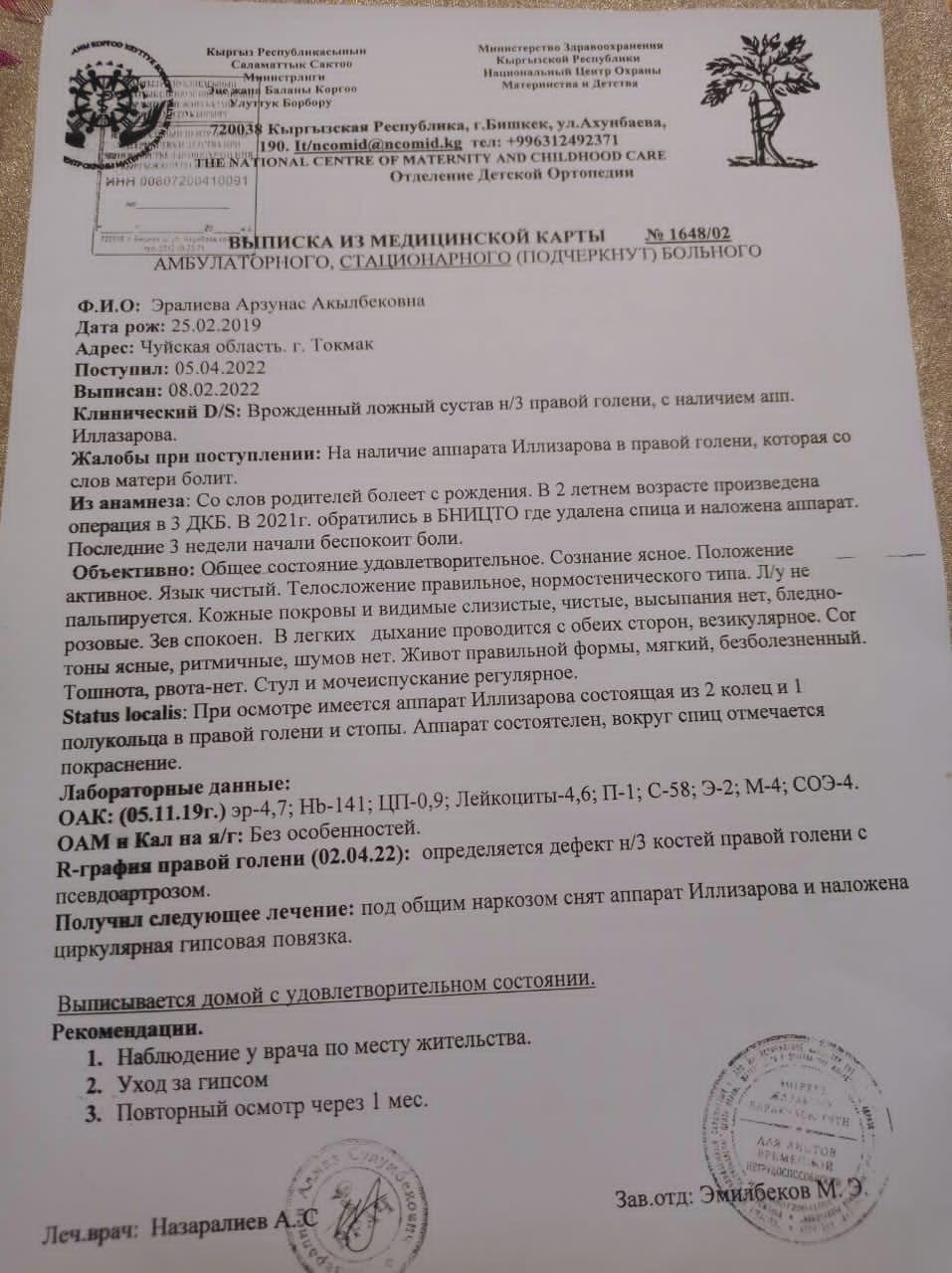 "Кызым 3 жарым жашта. 3-4 ай кезинде буту сынган. Ыйлап эле басылбагандан ооруканага барсак "жакшы" дешкен. Кийинчерээк дагы барганыбызда бутунда бир нерсе бар экен деп гиписттеп коюшкан. Ошол убактан бери эле ооруканалап жүрөбүз. Дарыгерлер (Правый нижней конечности, врожденная ложный сустав обеих костей голени справа) диагнозун коюшкан.