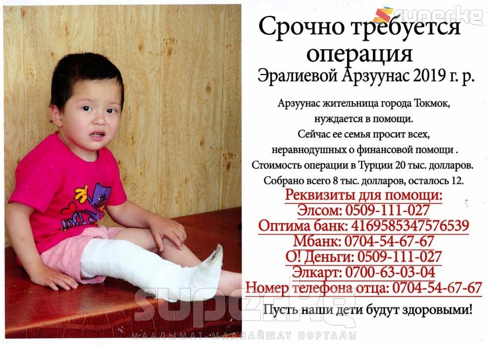 SUPER.KG порталына Акылбек Узакбаев аттуу жаран кайрылып, кызы Арзуунас Эралиевага операция жасатуу үчүн каражат жетпей жатканын айтып, кайрымдуу калктан жардам сурады.