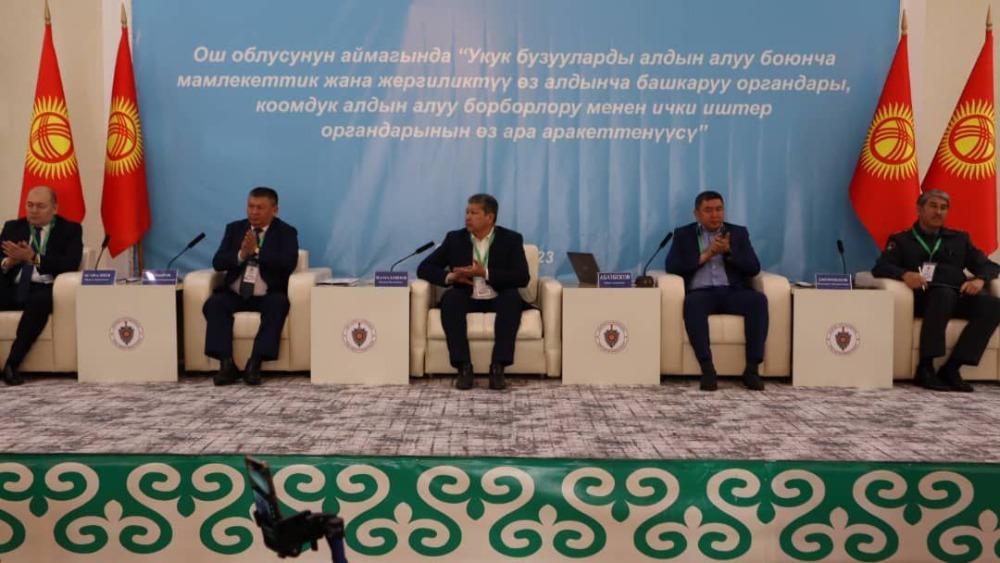 Бүгүн, 24-март күнү Ош шаарындагы “Jannat Resort” мейманканасында Ош облусунун аймагында укук бузуулардын алдын алуу боюнча мамлекеттик, жергиликтүү өз алдынча башкаруу органдарынын, коомдук алдын алуу борборлорунун өкүлдөрүнүн, коомчулуктун жана ички иштер органдарынын өз ара аракеттенүүсүн бекемдеген “Мыйзам, тартип жана жоопкерчилик ” аталыштагы форум өткөрүлдү.